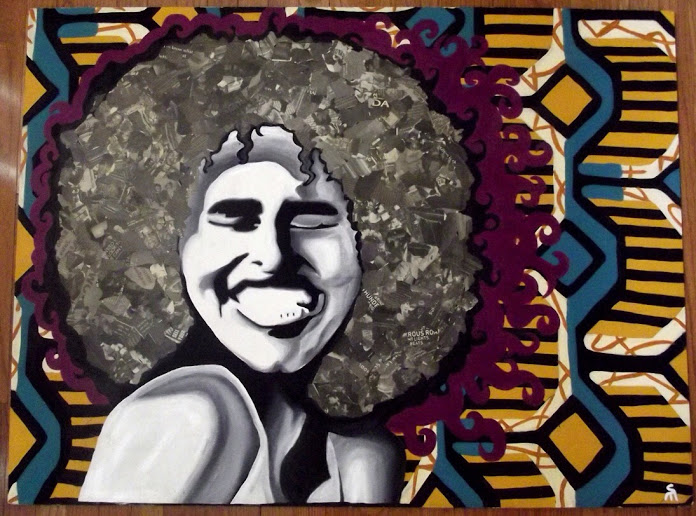 This painting was the beginning of my “new style” where I was trying to explore different and more interesting ways to represent the ideas I have in my head. This is collage (acrylic on canvas and wood). I am really inspired by beautiful women so I wanted to paint a confident natural goddess who is filled with the joy of life